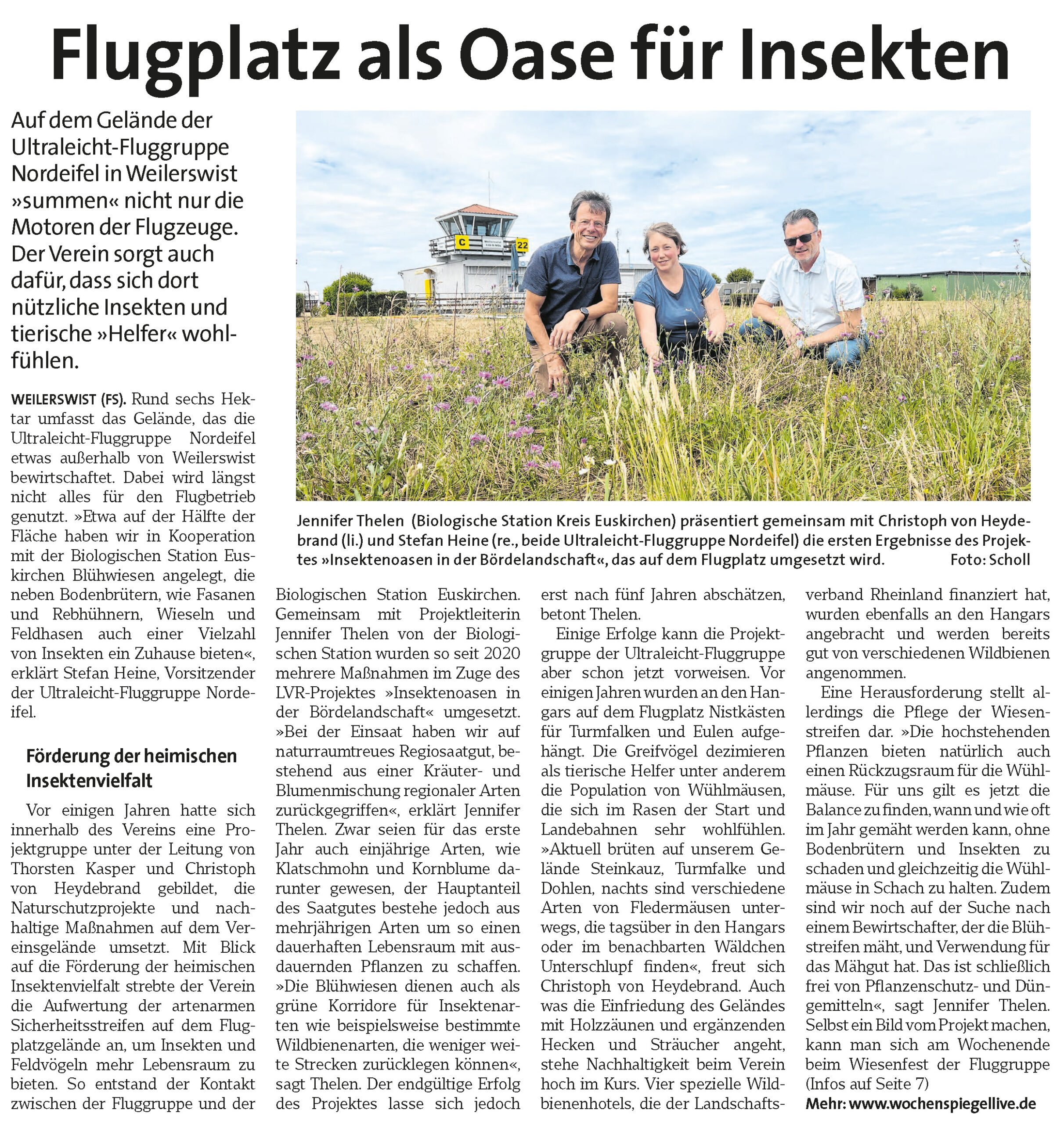 Auch der WochenSpiegel Euskirchen empfand unsere Naturschutzmaßnahmen so bemerkenswert, dass wir es mit einem Artikel am 2. August 2023 auf Seite 1 geschafft haben. Hier gehts zum Artikel. Zusätzlich zum Artikel hat der Wochenspiegel auch ein kleines Video zu unseren Sicherheitsstreifen und Insektenhotels veröffentlicht.